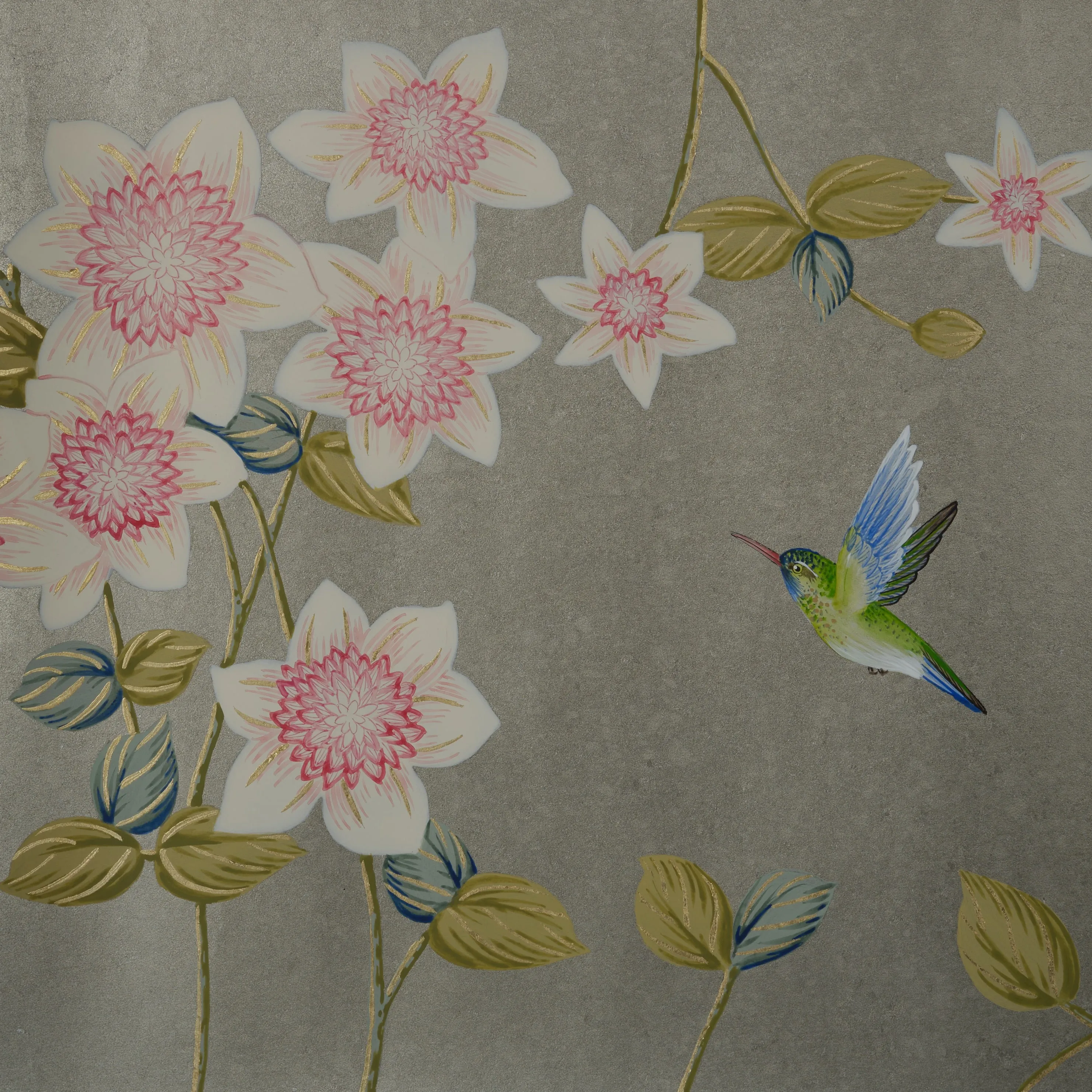 Panels start between $1,500 - $1,600 for a hand-painted design on silk or gilded paper. Prices increase with embellishments such as embroidery and beading as they are incredibly labor intensive as all the work is done by hand. It is possible to partially embroider the elements you wish to highlight in order to minimize the cost. We can provide a rough estimate based on your wall dimensions, chosen pattern, and any customization preferences.