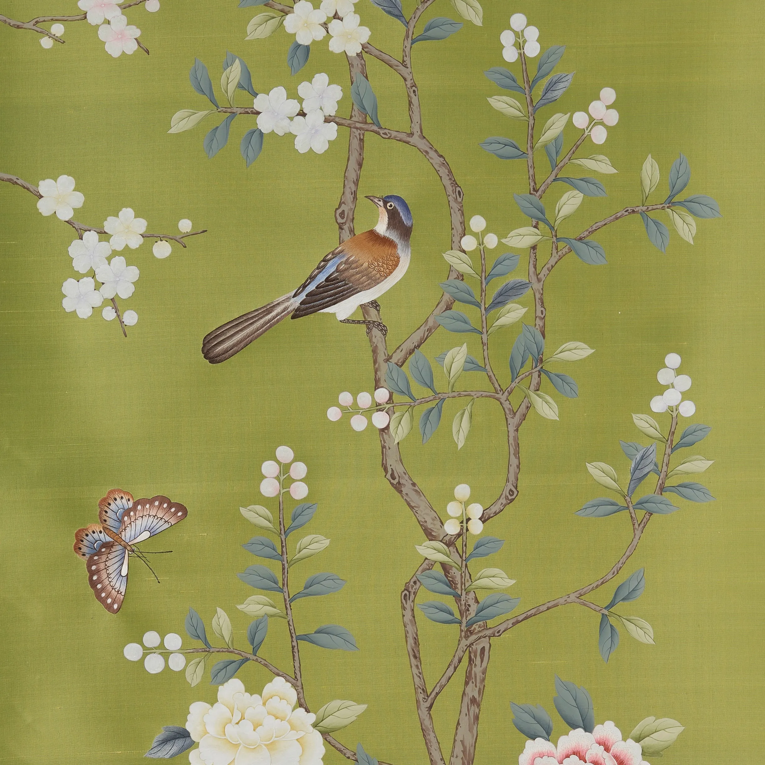 Enchanted Garden showcases delicate birds perched amongst flowering boughs while butterflies flutter above lush peony blooms that grace the garden floor. Hand-painted on silk or gilded paper with optional embroidery and beading embellishments, this design celebrates the quintessential beauty of flora and fauna in eternal springtime splendor. Inspired by the exquisite 18th century “bird and flower” chinoiserie wall coverings that grace the walls of grand English manors and of the Blair House parlor in Washington DC.