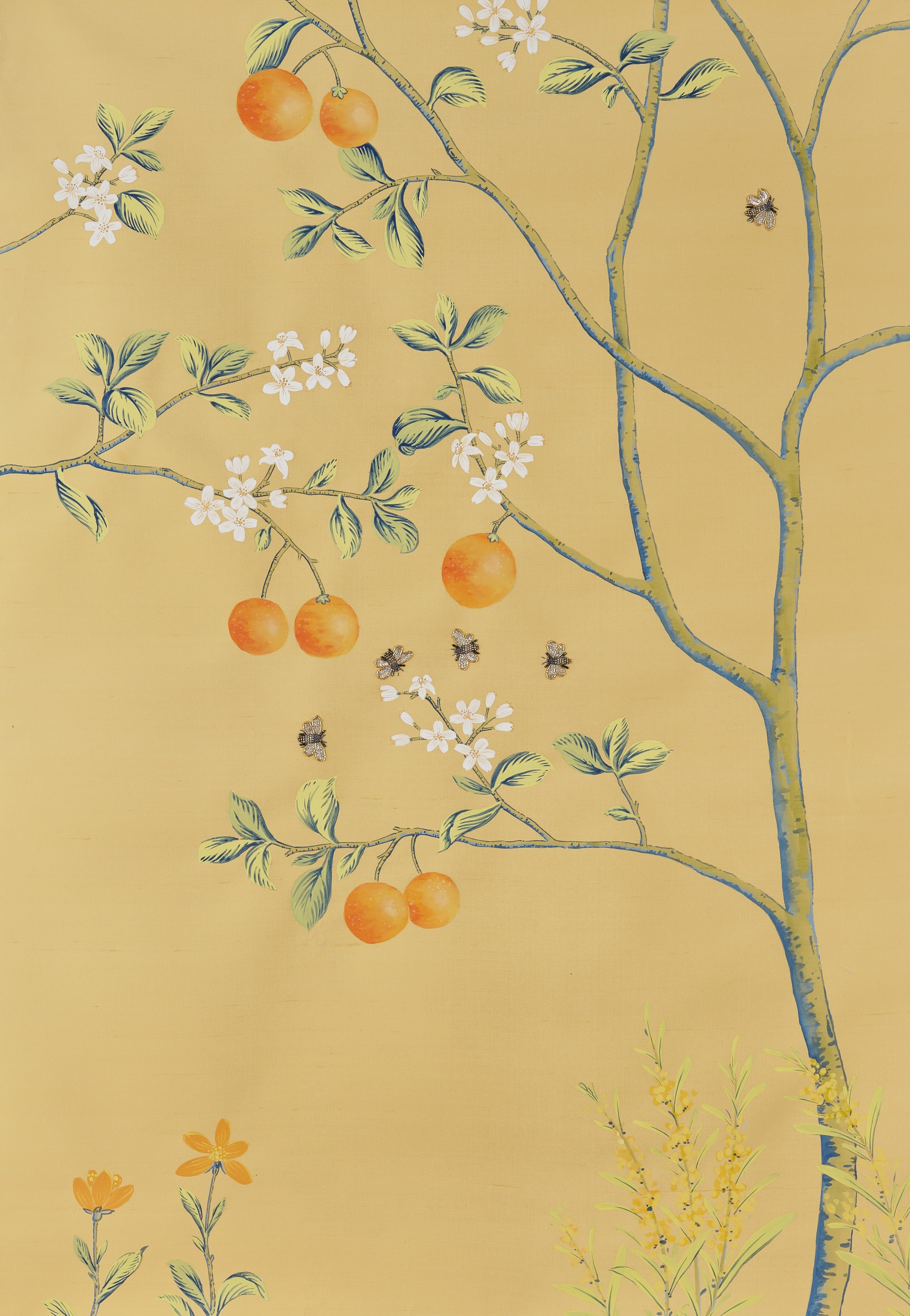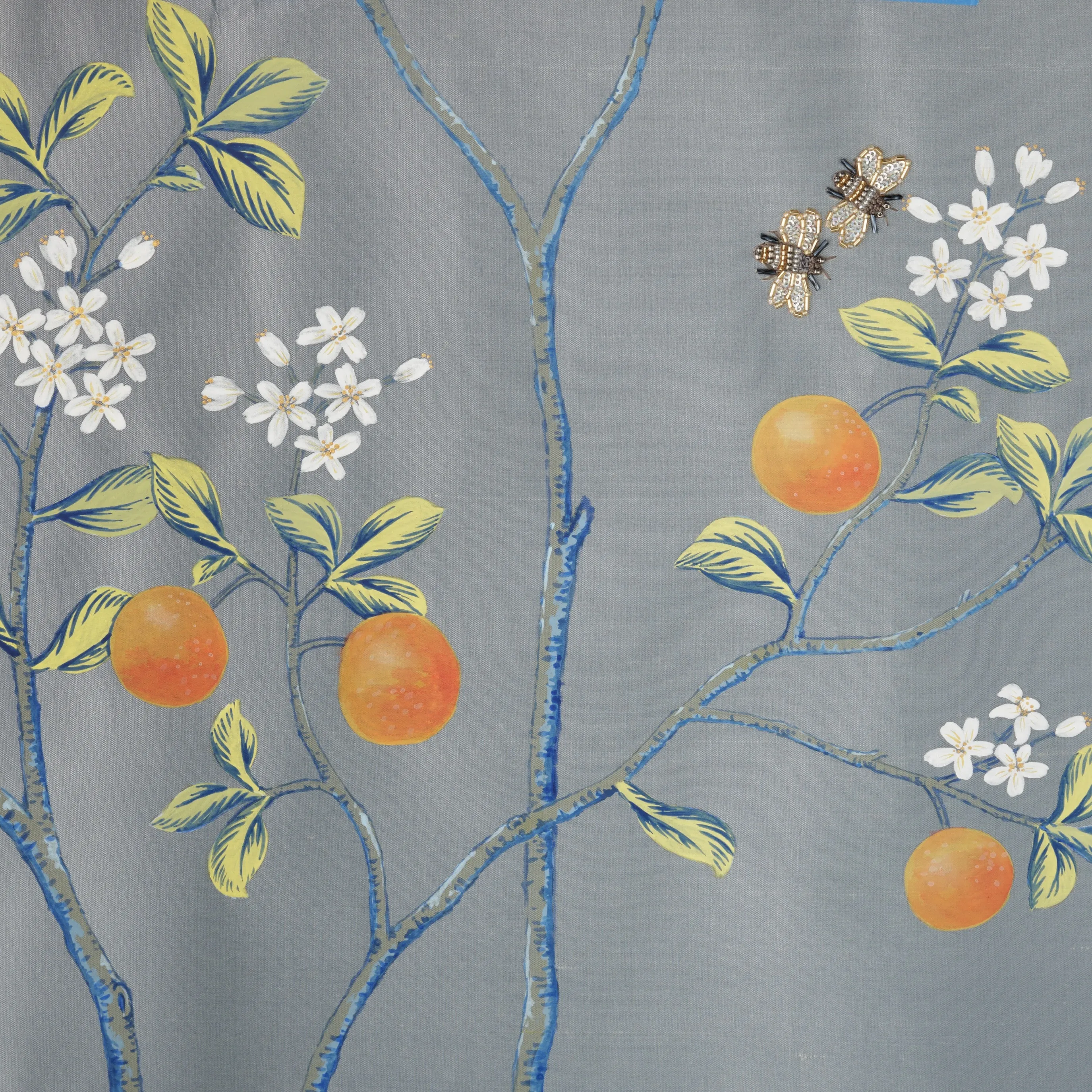 L'Orangerie conjures a grove of orange trees celebrating the abundant beauty of citrus in full bloom. Hand-painted on silk in vibrant color and accented with gold, this design comes alive as black and gold beaded bees crafted from glass beads and rhinestones buzz purposefully among the fragrant blossoms, their sequined wings catching light. The spirited painting style evokes the warmth and vitality of those sun-drenched groves, transforming your walls into a living tribute to California's fragrant heritage.