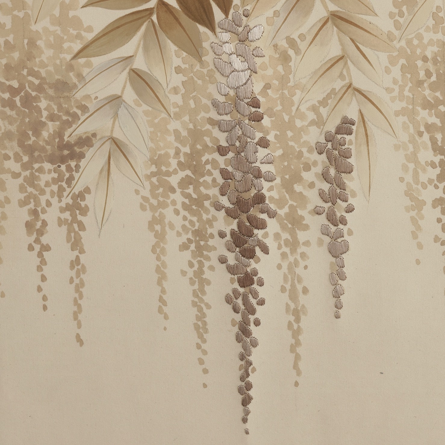 Discover the romantic allure of ancient Japanese gardens where cascading wisteria creates nature's most enchanting tapestry. Wisteria Vines captures the graceful drama of gnarled vines heavy with pendant clusters of lavender or white blossoms, their delicate petals dancing alongside whimsical curly tendrils. Hand-painted on silk or gilded paper with optional embroidery and beading, this design comes alive as silver and gold embroidered butterflies flutter amongst the fragrant blooms. Inspired by the masterful painted screens "Wisteria" by Maruyama Okyo from 18th century Edo Period Kyoto.